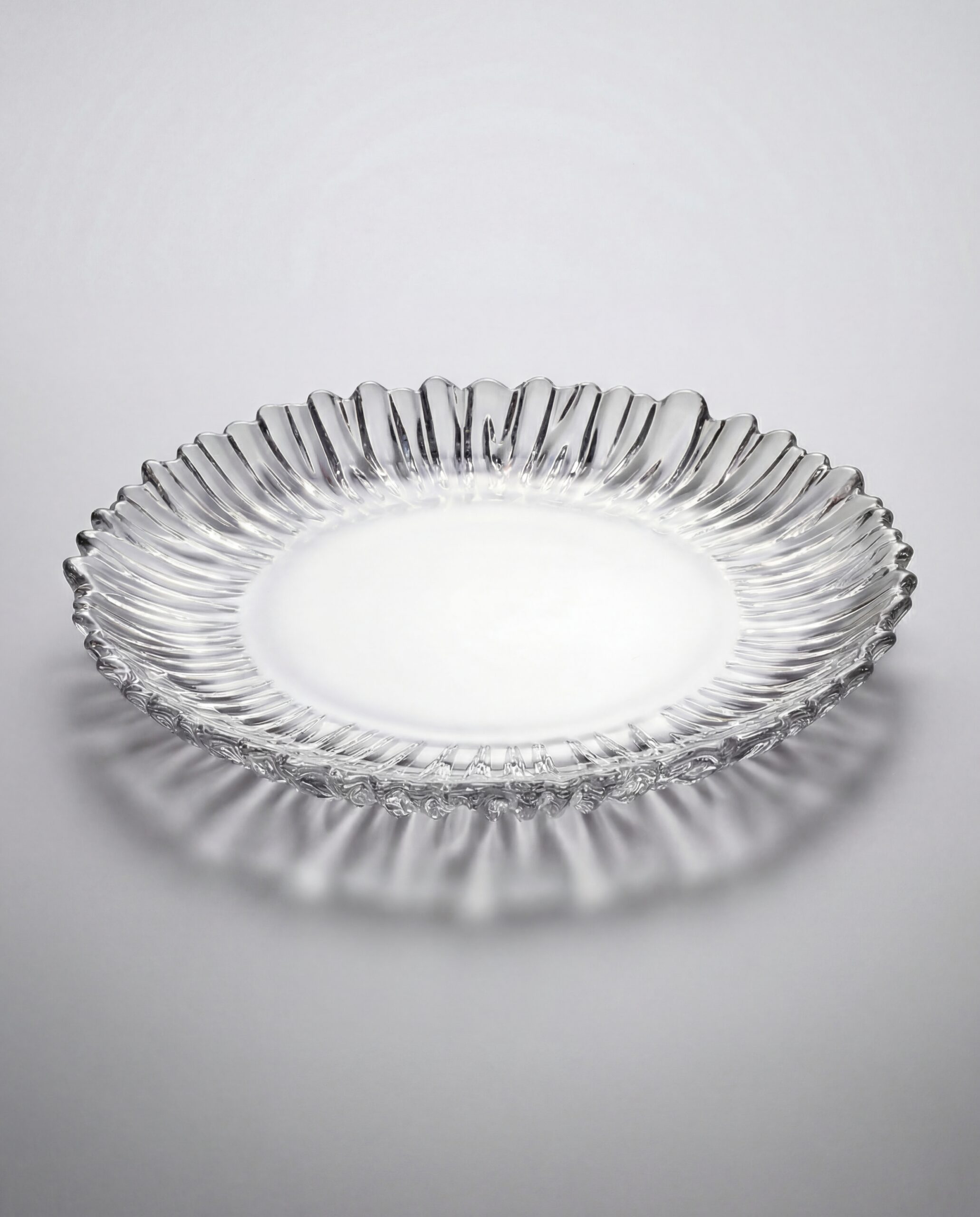 Farfurie platou din sticlă transparentă, cu finisaj elegant și formă rafinată, concepută pentru a completa decorul meselor la evenimente speciale.