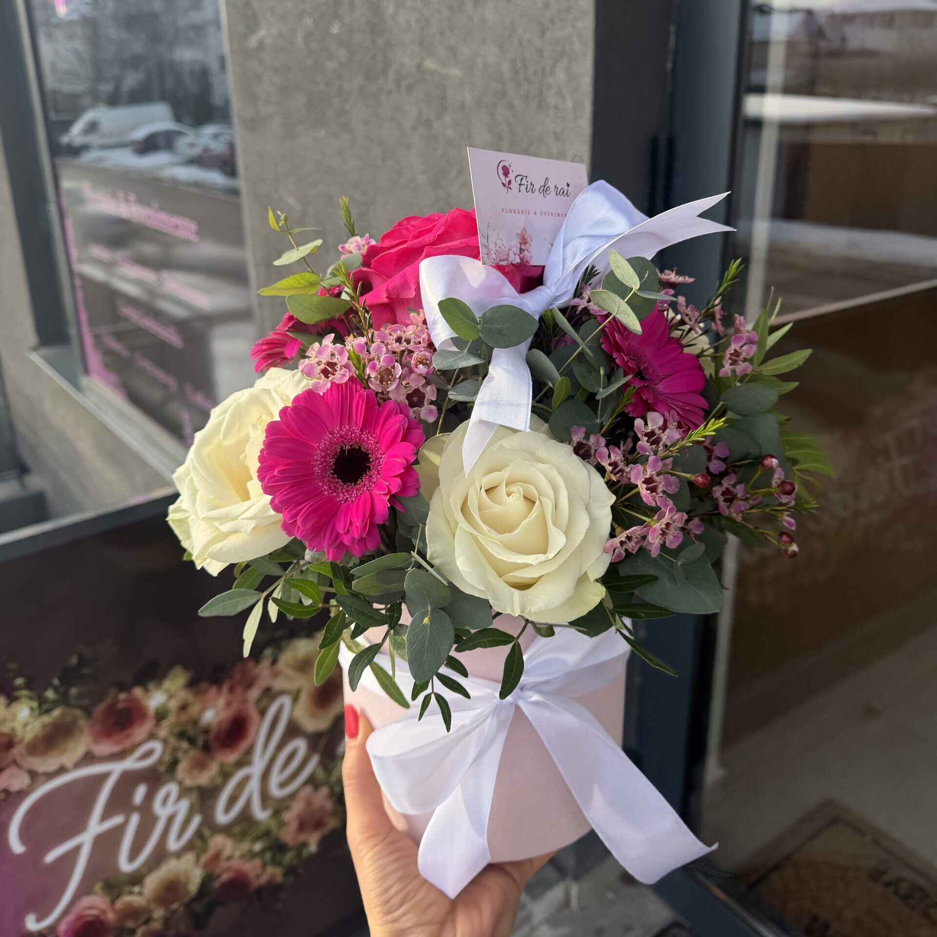 Un aranjament floral delicat și rafinat, realizat într-o cutie roz pastel, decorată cu fundă satinată elegantă. Trandafirii crem, combinați armonios cu trandafiri roz și flori decorative fine, creează un design feminin, sofisticat și modern.