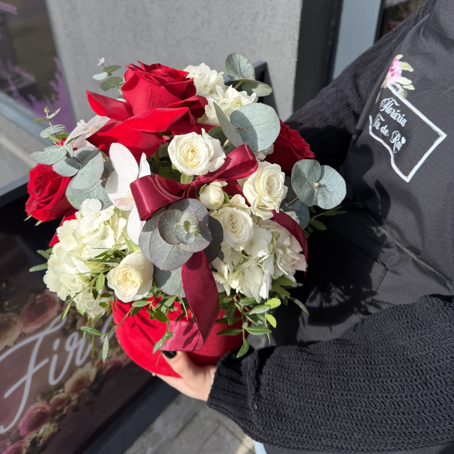 Surprinde persoana iubită cu un aranjament floral elegant în cutie roșie, realizat din trandafiri roșii pasionali și trandafiri albi delicați, completați de hortensie albă și frunze de eucalipt proaspăt. Contrastul dintre roșu intens și alb pur creează un design sofisticat, potrivit pentru momente speciale.